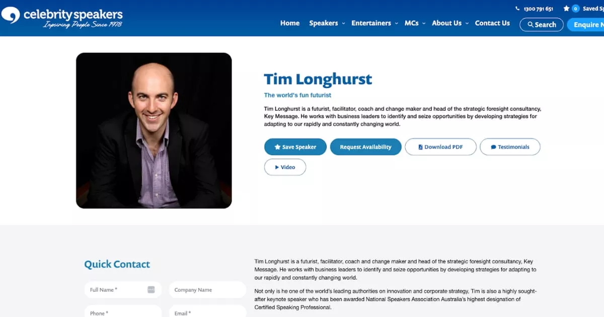 | Tim Longhurst | Interactive futurism/innovation sessions (engagement-led formats) | Future thinking, disruption, strategy/innovation | Over 2 decades | Via ODE Management |